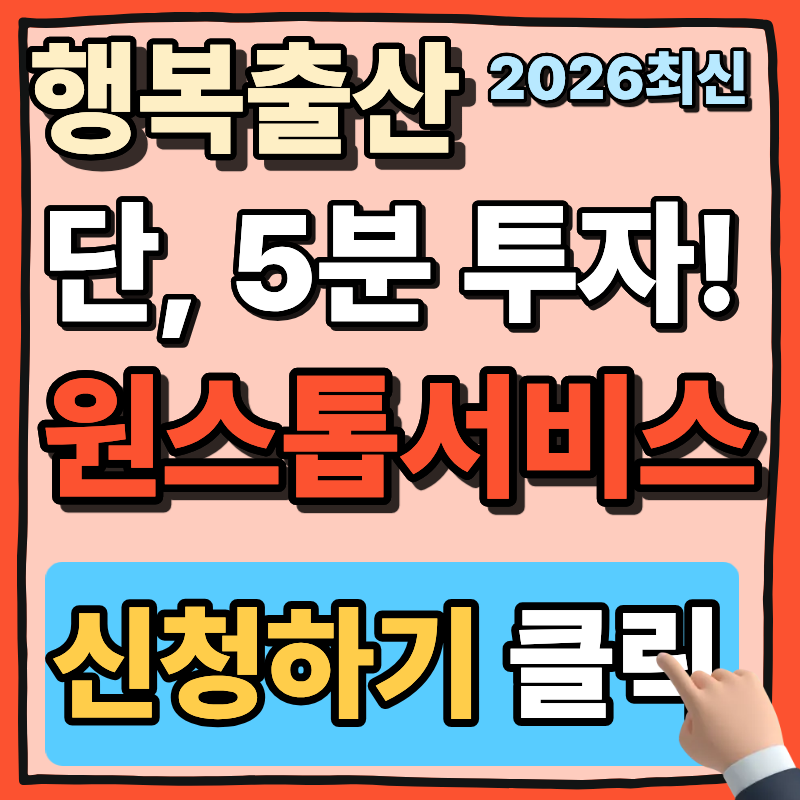 안녕하세요! 소중한 아이를 맞이하는 기쁨도 잠시, 챙겨야 할 서류와 복잡한 지원금 종류 때문에 머리가 아프신 초보 부모님들이 정말 많으실 겁니다. 특히 2026년부터는 아동수당 지급 연령이 확대되는 등 육아를 지원하는 반가운 소식들이 더욱 풍성해졌습니다. 이 많은 혜택을 일일이 찾아다니며 신청하지 않고, 단 한 번의 신청으로 모든 복지 혜택을 해결할 수 있는 꿀팁이 있습니다. 바로 행복출산 원스톱 서비스입니다. 지금 바로 행복출산 원스톱 서비스를 신청하시려면 아래 이미지나 버튼을 클릭하시면 됩니다.